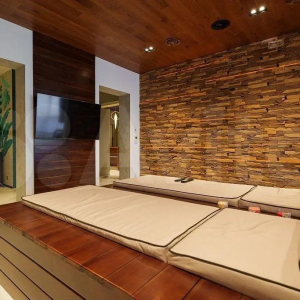 Квартира оснащена всем необходимым для жизни — от мебели до техники. В кухне установлен комплект бытовой техники, включая посудомоечную машину, духовку и кондиционеры. Есть спальные места, гардеробная, тёплые полы и даже сауна. Для отдыха и развлечений обустроен собственный домашний кинотеатр — редкость даже для элитной недвижимости Краснодара.